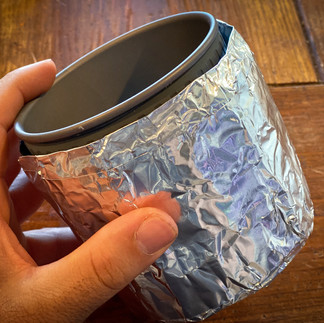 Using the to of the pot or even the lid, I traced a circle that would then rest on top of the rigid plastic lid that came with the cook pot. Using nice, sharp scissors I cut out the circle and in the middle cut a slit so the rubber handle of the pot lid could poke through. This will act as the handle to remove the insulation in order to pour my boiling water into backpacker meal packet. I can now move onto securing the top to the outside by using foil tape. I cut small strips of tape and started with taping the top to the side, then to secure that tape I taped around the outside with long piece of tape to keep the small strips from fraying up and off.