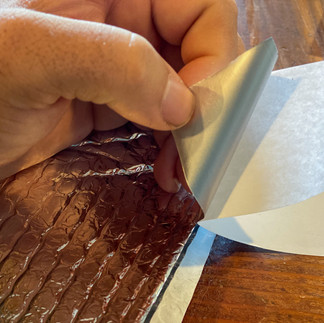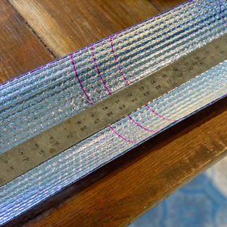 I am going to start with the backpacker meal koozie. It all starts with planning and measuring. The largest backpacker meal I have is the Peak Refuel, so I measured the height and width of one of these meal bags. The meal pouch is 9 ½” tall by 9” wide. For my design, I am considering a few things: 1. I want it to be able to stand upright while the meal is “cooking” after pouring in the boiling water. To accommodate that, I have an accordion fold on the bottom to enable it to stand. 2. I also want a flap over the top to attach with Velcro. This will allow me to fold the top over and seal it closed, keeping all the warmth inside so my meal will not lose heat and cook quicker. So, I cut a piece of the insulation 9 ½” wide and left the length of this the standard width of the roll which is 24”. I could now fold 9 ½” for the front, 3” for the bottom, and 11 ½” for the back, this would include the 9 ½” for the back and 2” for the flap. I have a 3 fold accordion fold on the bottom to allow the bag to stand. Each of these folds are 1 ½”, making the bottom 3" in width. I laid all of this out with a purple sharpie and then cut two strips of foil tape to 9 ½”. These foil tape strips will cover the seams on the sides.