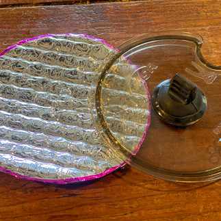 Once the outside of the cook pot is insulated, it is now time to move onto the lid. Since the MSR kit I have came with a plastic lid, I thought I would use this as the base for the insulated lid. The plastic lid is hard and sturdy, so it will add the needed structure to the very flimsy reflective insulation. By cutting a slit in the reflective material on the lid, I could use the handle on the plastic lid to lift off the entire koozie.