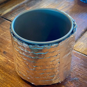 Step by step above outlines the measuring of the height of my cook pot. I decided to make my koozie slightly under this height. I wrapped the reflective insulation around the cook pot, not too snug though. If it is too snug it will not be able to be removed easily after the water has started boiling. I used the standard 24" width of the reflective insulation as the starting length for the koozie, knowing that I will wrap it around and have about an 1" of overlap that I will then cut and use the foil tape to secure in place.